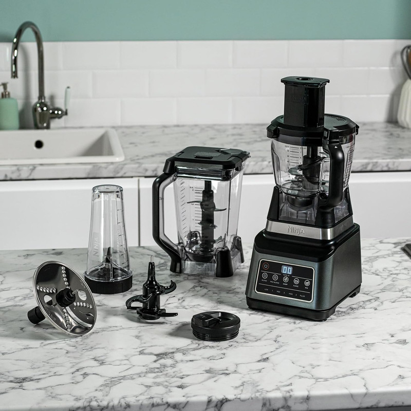 غذاساز نینجا مدل BN800 یک محصول خوش ساخت و مدرن از برند نینجا میباشد که خریداری آن، شما را از هرگونه محصول مشابه دیگر بی نیاز میسازد. به لطف موتور 1200 واتی با بیشترین سرعت چرخش 21000 دور در دقیقه این محصول، شما میتوانید انواع مواد غذایی را در کمترین زمان ممکن تهیه کنید و لذت ببرید. این دستگاه غذاساز نینجا مدل BN800 علاوه بر غذاساز، یک اسموتی ساز و مخلوط کن نیز هست و در عین پیشرفته بودن، کار کردن با آن بسیار آسان است. لازم به ذکر است که شما با داشتن آن میتوانید با بهره گیری از برنامه های مختلف آن از جمله تهیه اسموتی، پوره کردن، خرد کردن، به هم زدن، مخلوط کردن میوه ها یا مغزها، لذیذ ترین غذاها و نوشیدنی ها را تهیه کنید. بدنه این محصول از جنس پلاستیک بوده و ظاهری شیک با ترکیب رنگ خاکستری و مشکی دارد که جذابیت محصول را نه چندان افزایش داده است. به لطف کاسه 1.8 لیتری این غذاساز، امکان تهیه انواع مواد غذایی در حجم بالا برای شما فراهم میشود. این غذاساز نینجا مدل BN800 ابعاد جمع و جوری دارد که حمل را برای شما آسان میکند، همچنین فضای زیادی را درآشپز خانه اشغال نمیکند. پارچ غذاساز در برابر ضربه مواد غذایی سفت از جمله یخ مقاوم است، چرا که جنس آن از پلاستیک ضد ضربه میباشد. همچنین ظرفیت این پارچ 2.1 لیتر میباشد و برای تهیه انواع سس ها، نوشیدنی و اسموتی ها مناسب میباشد. برای این غذاساز از برند نینجا تیغه 6 پره و تیغه 4 پره در نظر گرفته شده است که با توجه به نیازتان میتوانید آنها را به کار ببرید. ضمناً این تیغه ها از استیل ضد زنگ ساخته شده اند و در برابر ضربه و خوردگی مقاوم هستند. دیسک های طراحی شده برای این غذاساز به منظور ریز کردن و تهیه برش های ورقه ای نازک استفاده میشوند. جنس این دیسک ها، همانند تیغه ها از استیل تهیه شده تا عمر و بازدهی بالایی داشته باشند. فناوری Auto_IQ در این محصول به کار گرفته شده است. نحوه عملکرد این فناوری بدین صورت میباشد که غذاساز با استفاده از پنج دستور کار هوشمند توانایی متوقف کردن اتوماتیک را پس از اتمام فرایند دارد. تنظیمات 3 سرعته و عملکرد پالس از قابلیت های خوب این محصول به شمار میروند. لازم به ذکراست بخش هایی از دستگاه که در تماس با مواد غذایی هستند فاقد BPA بوده و قطعات قابلیت شستشو در ماشین ظرفشویی را دارند.