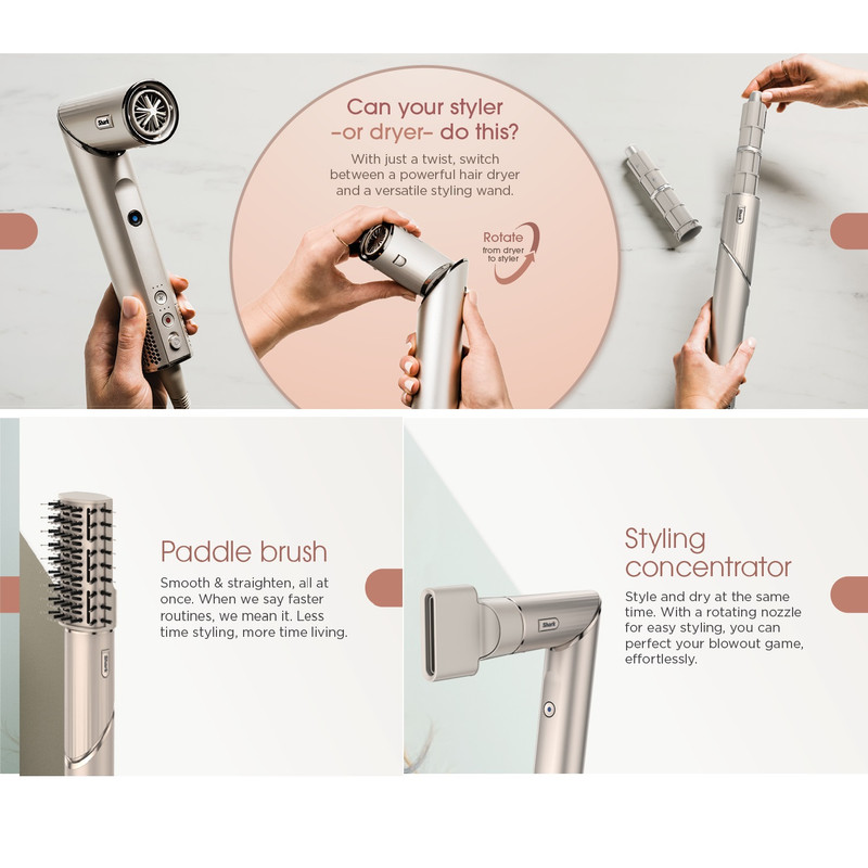 چندکاره و کارآمد : دیگر نیازی به خرید چندین ابزار حالتدهنده مو نیست. FlexStyle HD430 تمام نیازهای شما را برطرف میکند و جایگزین عالی برای چندین ابزار حالتدهنده است. بدون آسیب حرارتی : با خیال راحت موهای خود را حالت دهید، زیرا این دستگاه با کنترل هوشمند دما، سلامت موهای شما را تضمین میکند. مناسب برای انواع مو : از موهای صاف و موجدار گرفته تا موهای فر و مجعد، این دستگاه برای تمامی انواع مو طراحی شده است. هر سری بهگونهای طراحی شده که بدون کشیدن یا آسیب، بهترین حالتدهی را ارائه دهد.طراحی کاربرپسند : سبک، قابل حمل و با دکمههای کنترلی آسان برای تنظیم حرارت و سرعت. طراحی قابلتبدیل از سشوار به استایلر، حمل آسان و مناسب سفر و سالنهای آرایشی.نتایج حرفهای در خانه : با Shark FlexStyle میتوانید به راحتی مدلهای موی سالنی را در خانه خود ایجاد کنید. این دستگاه عملکرد حرفهای در خانه را برای شما به ارمغان میآورد.