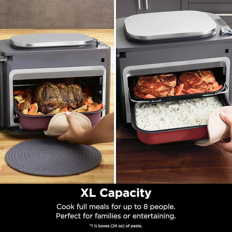 این مولتی کوکر نینجا مدل SFP700 یک فر چند کاره هست که میتوان با 10 برنامه پخت مجزا با آن کار کرد. دیگر به روغن اضافی نیازی ندارد و غذا ها را با همان کیفیت و طعم شروع به پخت میکند. ظرفیت این مولتی کوکر نینجا مدل SFP700 با حجم 30 لیتری بوده و برای یک خانواده 10 نفره مناسب هست. توان مصرفی برای این محصول 1760 وات هست و دارای صحفه نمایشگر دیجیتال هست و همچنین کنترل پنل این سرخ کن دارای تاچ لمسی بوده و به راحتی میتوان برنامه پخت را تنظیم نمود. قطعات داخلی مولتی کوکر نینجا SFP700 را میتوان جدا کرد و شستشو داد، محفظه سرخ کن به راحتی قابل جدا شونده هست. دارای شستشوی آسان و جنس محفظه سرخ کن از نوع تفلون نچسپ بوده و از کیفیت خوبی برخوردار هست. مولتی کوکر نینجا SFP700 دارای قطع کن اتوماتیک هست و میتوان پس از تنظیم برنامه دلخواه آن را به حالت خود رها کرد و با خیال راحت به دیگر کارهای منزل رسید. این محصول دارای 10 برنامه پخت بوده و بنا به نیازی که داریم قابل تنظیم هست.