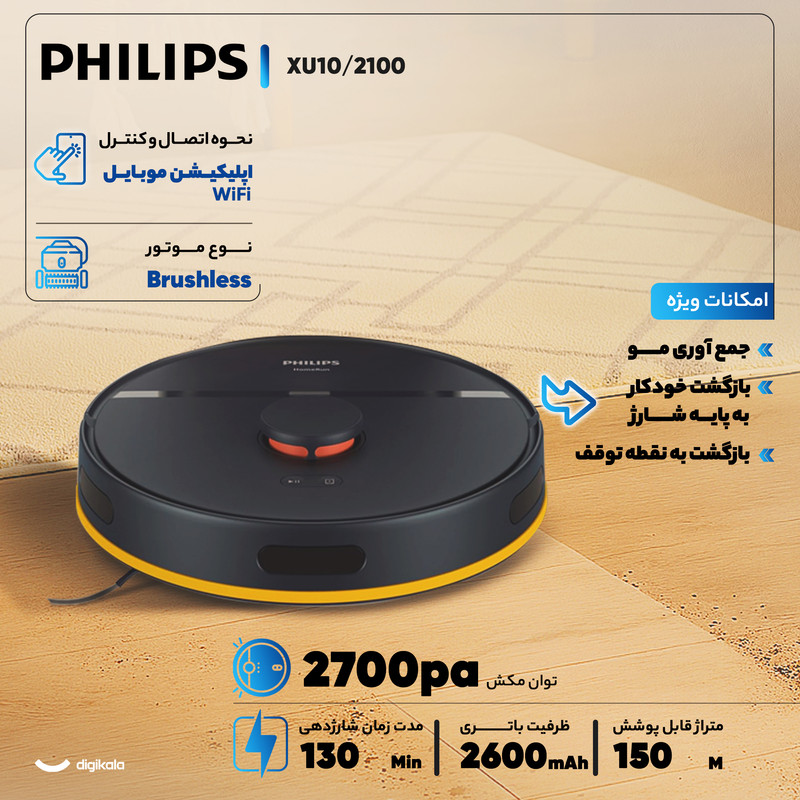 جاروبرقی رباتیک فیلیپس مدل XU2100/10 با ابعاد ۳۴۵x۳۴۵x۹۷ میلیمتر و وزن ۳.۱ کیلوگرم، یک دستیار هوشمند و کارآمد برای نظافت منزل شماست. این جارو رباتیک با توان مکش ۲۷۰۰ پاسکال و موتور براشلس (Brushless)، به راحتی گردوغبار را از سطوح مختلفی مانند پارکت، لمینت، سرامیک، شیشه و فرش جمعآوری میکند. صدای عملکرد آن تنها ۶۶ دسیبل است و فیلتر خروجی HEPA 11 نیز به تصفیه هوای خروجی کمک میکند. باتری ۲۶۰۰ میلیآمپر ساعتی این دستگاه، امکان ۱۳۰ دقیقه کارکرد مداوم را فراهم میکند که برای نظافت مساحت ۱۲۰ تا ۱۵۰ مترمربع کافی است. مدت زمان شارژ کامل آن ۳۳۰ دقیقه است و پس از اتمام شارژ، به صورت خودکار از جایی که متوقف شده، به کار ادامه میدهد. سیستم مسیریابی ژیروسکوپی آن، در کنار سنسورهای ضدبرخورد، ضدسقوط و تشخیص ضخامت فرش، مسیریابی هوشمند را تضمین میکند و از موانع تا ارتفاع ۱۷ میلیمتر عبور میکند. این جارو با قابلیت تیکشی مرطوب و مخزن آب ۰.۳ لیتری، نظافتی کامل و جامع را ارائه میدهد. پایه شارژ آن با ابعاد ۲۶۰x۱۷۲x۲۹۱ میلیمتر، قابلیت تخلیه خودکار زباله و شارژ مجدد جارو را فراهم میکند. کنترل این جارو رباتیک از طریق اتصال وایفای (۲.۴ و ۵ گیگاهرتز) و اپلیکیشن Philips HomeRun امکانپذیر است و با سیستم عاملهای اندروید و iOS سازگار است. یک نشانگر LED نیز وضعیت دستگاه را به شما نشان میدهد.