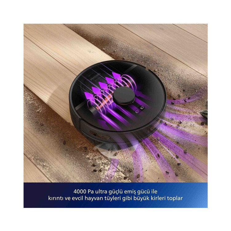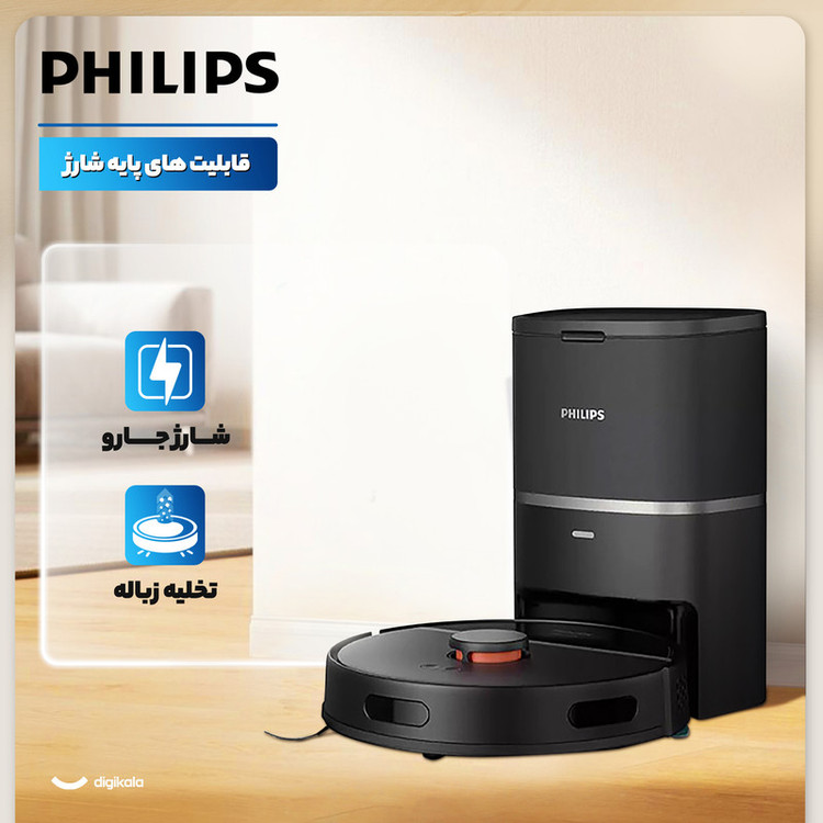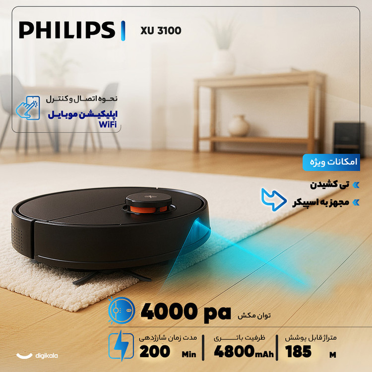 جاروبرقی رباتیک فیلیپس مدل XU 3100 با ابعاد ۳۴۱x۳۴۱x۹۶ میلیمتر و وزن ۳.۸ کیلوگرم، دستگاهی کارآمد و هوشمند برای نظافت خانه شماست. این جارو رباتیک با توان مکش ۴۰۰۰ پاسکال و موتور براشلس (Brushless)، به راحتی گردوغبار و زباله را از سطوح مختلفی مانند پارکت، لمینت، سرامیک و انواع فرش و موکت جمعآوری میکند. فیلتر خروجی HEPA نیز به تصفیه هوای خروجی کمک کرده و محیطی سالمتر را فراهم میآورد. باتری ۴۸۰۰ میلیآمپر ساعتی این جارو، تا ۲۰۰ دقیقه کارکرد مداوم را فراهم میسازد که برای نظافت مساحت ۱۸۵ مترمربع کافی است. سیستم مسیریابی لیزری (LIDAR) و نقشهبرداری LDS، در کنار سنسورهای ضدبرخورد و ضدسقوط، به طور دقیق مسیر حرکت را مشخص کرده و از برخورد با موانع و سقوط از پلهها جلوگیری میکند. همچنین، این جارو با قابلیت تشخیص ضخامت فرش، عملکرد خود را به صورت هوشمند تنظیم میکند. این دستگاه با قابلیت تیکشی، نظافتی کامل و جامع را ارائه میدهد. کنترل این جارو رباتیک از طریق اتصال وایفای و اپلیکیشن Philips HomeRun امکانپذیر است. پایه شارژ آن نیز قابلیت بازگشت خودکار جارو را برای شارژ مجدد فراهم میکند تا پس از اتمام کار، دستگاه آماده دور بعدی نظافت باشد. این جارو با مخزن زباله ۰.۳۵ لیتری، مخزن آب ۰.۳ لیتری و مخزن زباله ۳ لیتری در پایه شارژ، به صورت هوشمند زبالهها و مایعات را مدیریت میکند.
