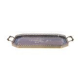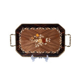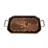 - این سینی معرقکاری بینظیر، تلفیقی از هنر اصیل و دوام مدرن است. در ساخت این اثر، از چوبهای ارزشمندی چون گردو و افرا استفاده شده است تا بافت و رنگ طبیعی هر چوب، جلوهای خیرهکننده ایجاد کند. نقش گلدار و ظریف روی زمینه تیره گردو، با کنتراست رنگهای روشن افرا ، زیبایی و عمق خاصی به کار بخشیده است. حاشیه آلومینیومی با روکش طلایی، این اثر هنری را قاب گرفته و به آن جلوهای لوکس و ماندگار بخشیده است. این سینی فراتر از یک وسیله پذیرایی، اثری هنری است که هر جمعی را باشکوهتر کرده و میتواند سالها به عنوان یک میراث ارزشمند باقی بماند.