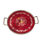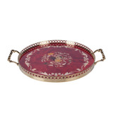 در مرکز سینی، طرحی زیبا از گلهای رنگی با استفاده از تکنیک معرقکاری (مارکتری) به زیبایی خودنمایی میکند. قاب و دستههای سینی از جنس آلومینیوم و با طراحی پیچیده و حکاکیشده، این محصول را به یک گزینه ایدهآل برای دکوراسیونهای خاص و هدیهای فراموشنشدنی تبدیل میکند.
