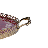 این سینی بینظیر، یک اثر هنری لوکس و چشمنواز است که با رنگ جذابش، نگاهها را به خود خیره میکند. زمینه اصلی سینی از چوب رنگشده به رنگ سرخ ساخته شده که با طرح رگههای طبیعی چوب، عمق و زیبایی خاصی به آن میبخشد. نقوش ظریف و پیچکهای اطراف، با چوب سفید و روشن مثل افرا، با دقت و ظرافت روی این زمینه کار شدهاند.