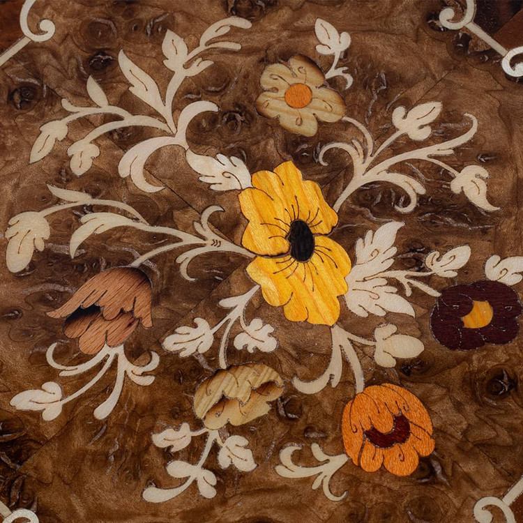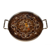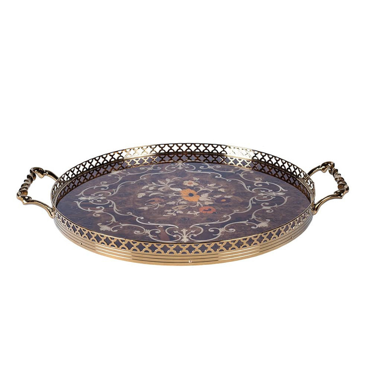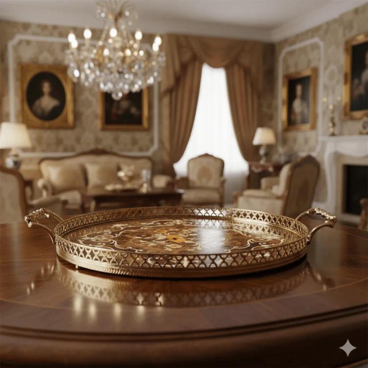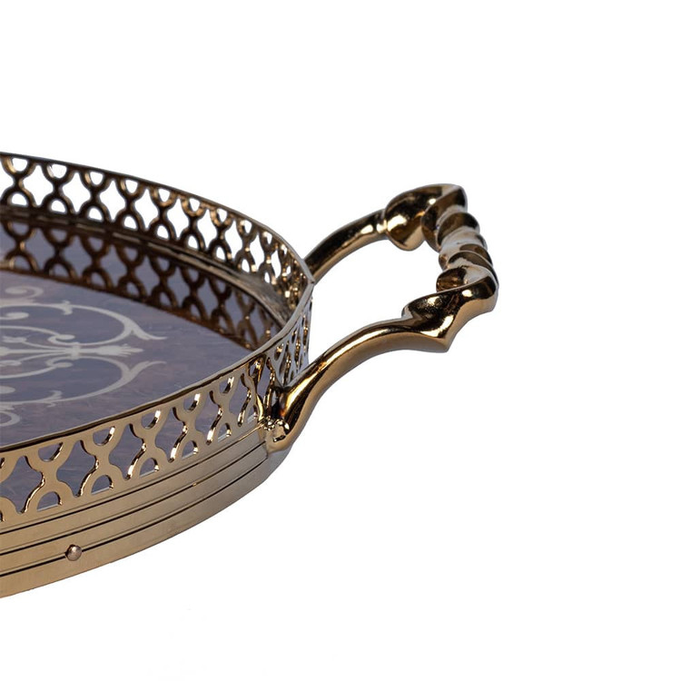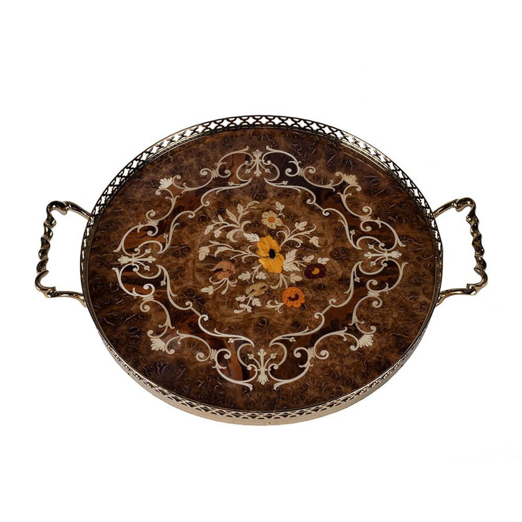 این سینی گرد لوکس با کف چوبی معرق از ریشه چوب گردو ساخته شده و طرح گلوبوته مرکزی آن با چوبهای طبیعی افرا، راش و افرا طلایی جلوهای هنری و اصیل پیدا کرده است. لبه فلزی مشبک با آبکاری براق و دستههای پیچخورده فلزی استحکام و زیبایی را همزمان فراهم میکنند. رنگ قهوهای کهربایی با بافت چشمگیر ریشه چوب در کنار خطوط معرق روشن، تضادی دلنشین ایجاد کرده که این سینی را برای پذیرایی مجلل و دکوراسیون کلاسیک ایدهآل میسازد