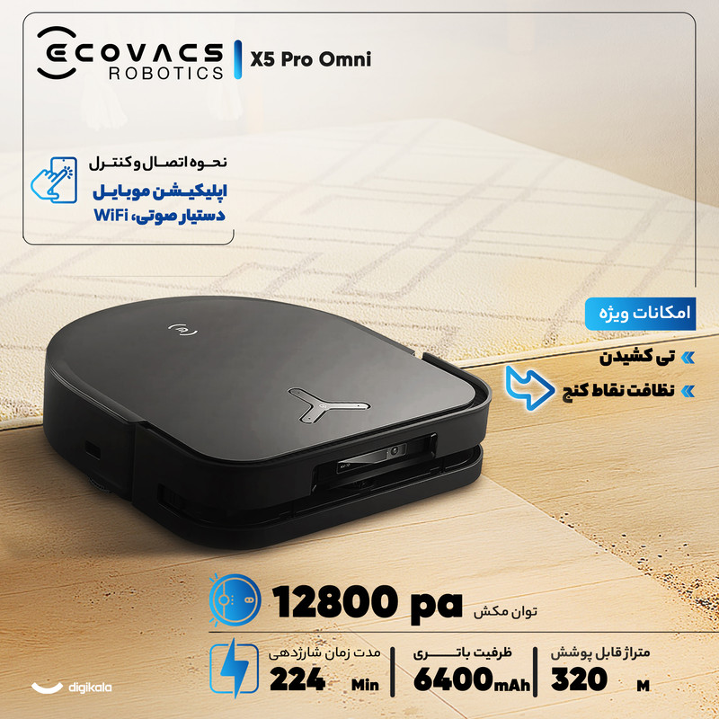 الگوریتم هوشمند AINA 2.0 این سیستم امکان اجتناب از موانع و فرمانبری دقیق را فراهم میکند و اطمینان میدهد که ربات مسیر بهینهای را برای نظافت انتخاب کند. با استفاده از هوش مصنوعی پیشرفته، خانه شما را نقشهبرداری کرده و با قدرت مکش فوقالعاده 12800 پاسکال، میتواند حتی سرسختترین گرد و غبار را از روی سطوح سخت و فرشها پاک کند همچنین از موانعی تا 22 میلی متر بدون نیاز به کمک عبور کند . تی کشی این ربات به صورت کاملا هوشمند است به صورتی که اگر قسمتی از خانه لکه های سخت تری داشته باشد با تنظیم هوشمند، نظافتی عمیق تر را انجام میدهد. ربات دارای دو پد تی چرخشی است و سنسور تشخیص فرش هم دارد . هنگامی که ربات به گوشه خانه میرسد به صورت خودکار بازوی تی رو بیرون میاره و لبه هارو تا فاصله 1 میلیمتری تقریباً تمام لبهها را تمیز میکند . ایستگاه داکینگ هوشمندOMNI یک سیستم چندمنظوره است که شستشوی خودکار پد با آب داغ ، خشک کردن با هوای گرم، و تخلیه خودکار را انجام میدهد. ویژگیهای مبتنی بر هوش مصنوعی X5 Pro Omni با دستیار صوتی YIKO ارتقاء یافته ارائه میشود که از مکالمات چند نوبتی، تنظیم وظایف و سایر دستورات تعاملی پشتیبانی میکند.با ارتفاع تنها 95 میلیمتر، این ربات به راحتی زیر مبلمان را تمیز کرده و به مناطق سخت دسترس میرسد. دارای باتری 6400 میلیآمپر ساعتی است که تا 164 دقیقه نظافت مداوم را با یک بار شارژ فراهم میکند، که برای پوشش مساحتهای بزرگ کافی است. این ربات برای کسانی طراحی شده است که به دنبال یک راهحل نظافتی قدرتمند، هوشمند و کمهزینه هستند. ترکیب قدرت مکش بالا، ناوبری هوشمند و ویژگیهای جامع نظافت، تجربهای بینظیر از نظافت خانه را ارائه میدهد.
