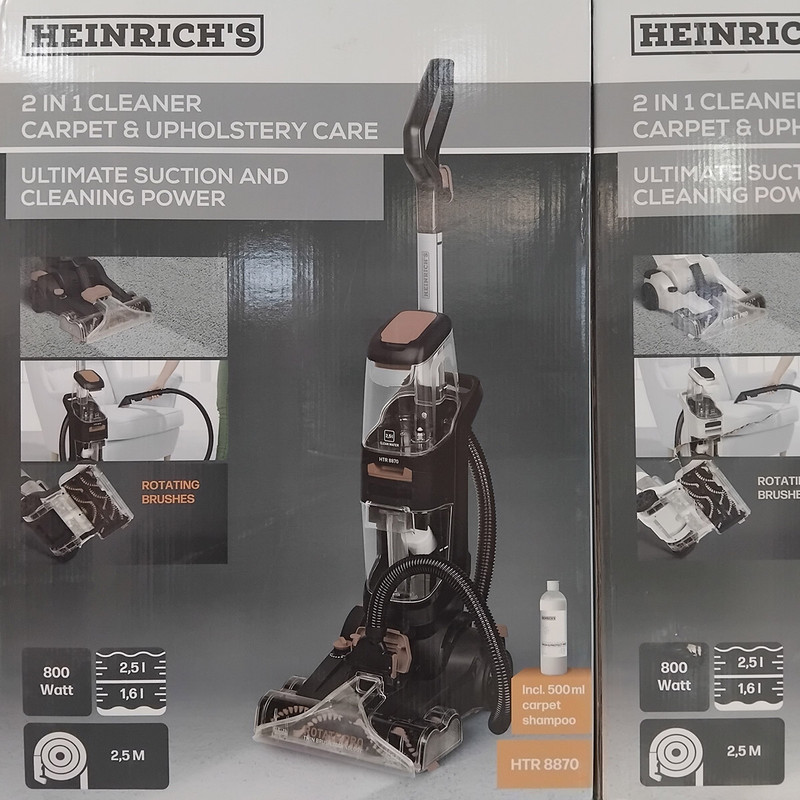 فرش شوی و مبل شوی هاینریش (هنریچ) آلمان مدل HTR 8870: فرش شوی و مبل شوی هاینریش که یکی از مدعیان بازار بوده و دارای طراحی بسیار متفاوت تری نسبت به سایر فرش شور های داخل بازار می باشد. مدل 8870 که سری جدید و ساخت سال 2025 می باشد، طراحی ظاهری فوق العاده خاصی دارد و با توان بالا و قدرت مکش فوق العاده ایی که دارد، از بهترین محصولات شستشوی فرش و مبل می باشد. پلاستیک فشرده مستحکم در کنار موتور سنگین این دستگاه حس اصالت و کیفیت را به مصرف کننده منتقل میکند. فرش شوی و مبل شوی هنریچ آلمان مدل HTR 8870 در دو رنگ سفید و مشکی تولید شده است. فرش شوی و مبل شوی هنریچ آلمان مدل HTR 8870 با قابلیت تمیز کردن همه سطوح و قدرت بالا برای هر خانه ای لازم است. فرش ها و مبلمان در هر خانه ای، نقش مهمی در دکوراسیون و ایجاد حس راحتی دارند. با گذشت زمان و استفاده مداوم، کثیفی، لکه ها و گرد و غبار بر روی آن ها جمع می شود و ظاهرشان را ناخوشایند می کند. در این میان، استفاده از دستگاه های حرفه ای شستشو، مانند فرش شوی و مبل شوی هنریچ آلمان مدل HTR 8870، می تواند این مشکل را به بهترین شکل ممکن حل کند.